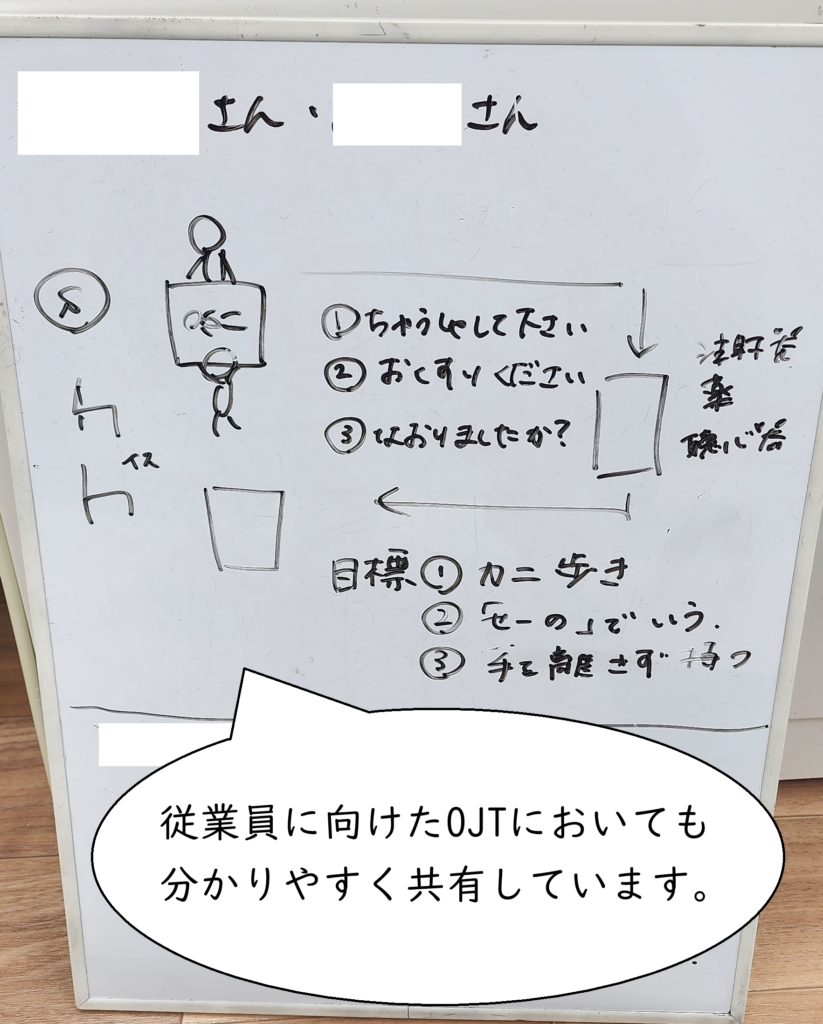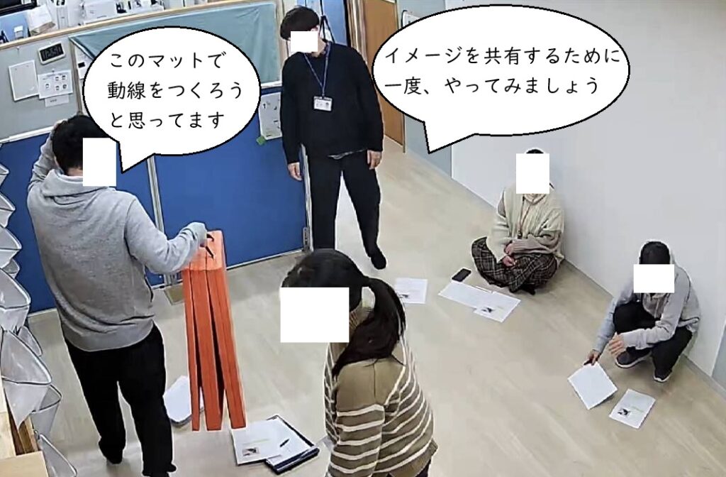 本日行うプログラム内容について、従業員らに共有します。パートさんとペアで進行するため、役割分担等も決めておきます。