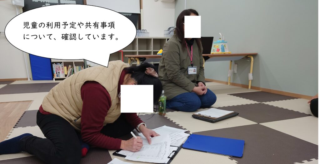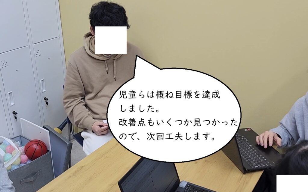 本日の児童の様子や、療育プログラムの進め方等について、従業員らにフィードバックします。